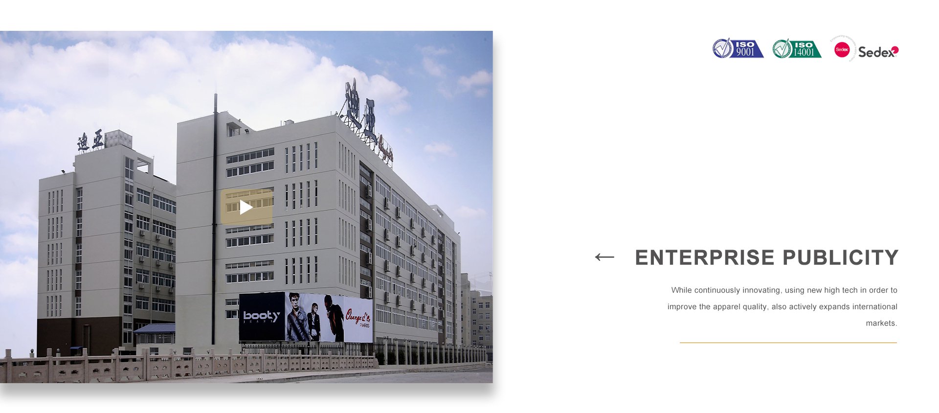 浙江迪亞服飾有限公司于1998年在世界時(shí)尚品牌之都——法國(guó)巴黎二區(qū)應(yīng)運(yùn)而生。同年,在浙江省甌海經(jīng)濟(jì)開發(fā)區(qū)東方南路28號(hào)設(shè)立服裝制造工廠。公司集服裝設(shè)計(jì)、生產(chǎn)、營(yíng)銷、品牌于一體,在不斷創(chuàng)新、采用高新技術(shù)提高服飾質(zhì)量的同時(shí),積極拓展國(guó)際市場(chǎng),海外營(yíng)銷部長(zhǎng)期與LV集團(tuán)旗下的MAJE、SOEUR、BALIBARIS等國(guó)際著名品牌保持非常緊密的合作關(guān)系。